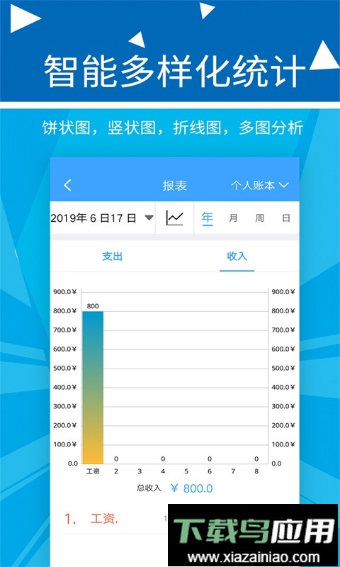 以折线图与饼图呈现数据,直观了解每周、每月收支结构。