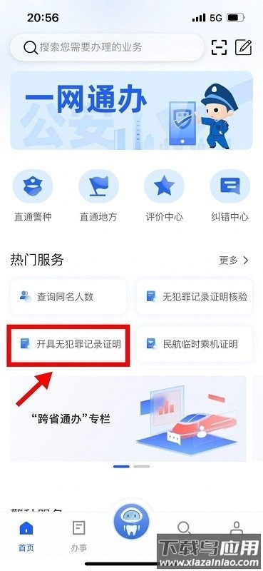 1、在应用首页的“热门服务”区域,找到并点击“开具无犯罪记录证明”选项。