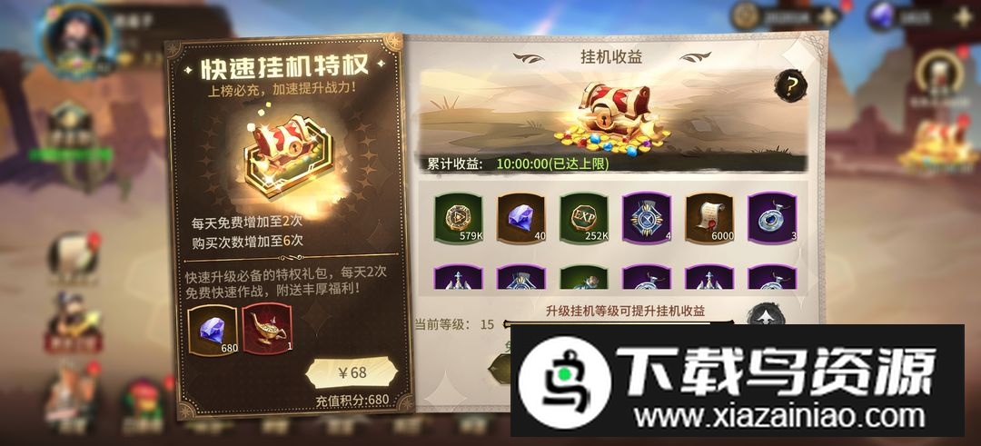 1、主线挂机等级:推进主线可提升挂机等级,务必及时点击升级,挂机产出的资源将大幅增加;