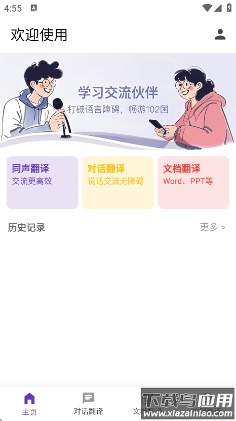 首页提供同声传译、对话翻译、文档翻译等功能入口,也可以查看以往翻译记录。
