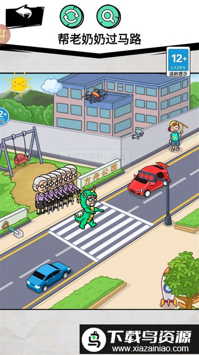 这是一款休闲益智小游戏,玩家需要运用场景中的各种元素,发掘隐藏的物品与线索,解决接连出现的难题。每一个关卡都要求你开动脑筋,灵活想象,才能找到正确的通关方法;面对川流不息的马路与往来车辆,年迈的老奶奶显得手足无措,现在就需要聪明的你来帮她安全穿过街道。