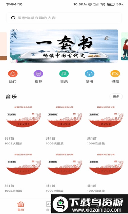 4、首页清晰划分了热门推荐、音乐专区、听书板块等不同服务区域;