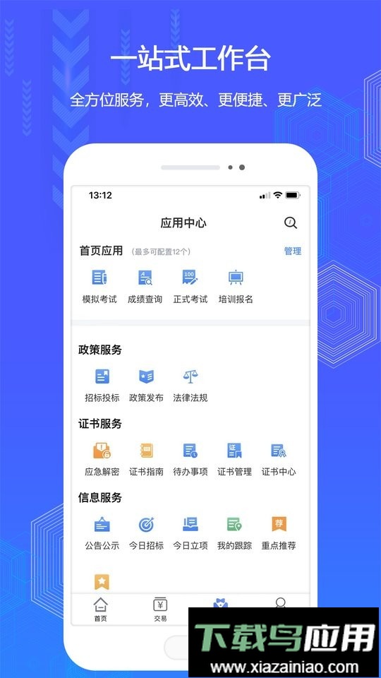 该应用能够通过互联网连接交易平台、评标系统、招投标工具及发证机构;借助接口与二维码扫描,为外部系统提供证书服务、政策解读、信息查询、在线考试、学习资源及交易支持等功能。用户仅需一部手机即可完成CA证书申领,实现多平台无缝兼容,支持企业多名管理人员共享使用电子印章。操作简便,管理灵活,为企业日常运营带来显著便利。
