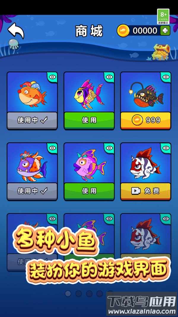 2、解锁众多造型可爱的小鱼,指挥它们灵活游动,疯狂吞食场景中的所有鱼饲料。