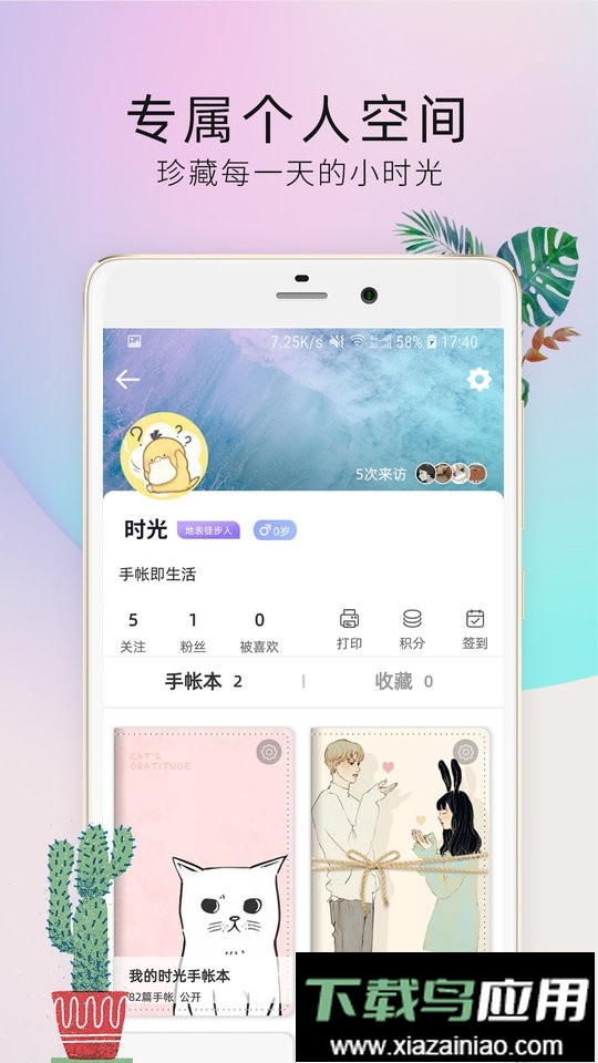 点击“我的”进入个人中心,可以查看积分与手帐概况;手帐按“手账本”分类存放,支持新建不同手账本以便整理。