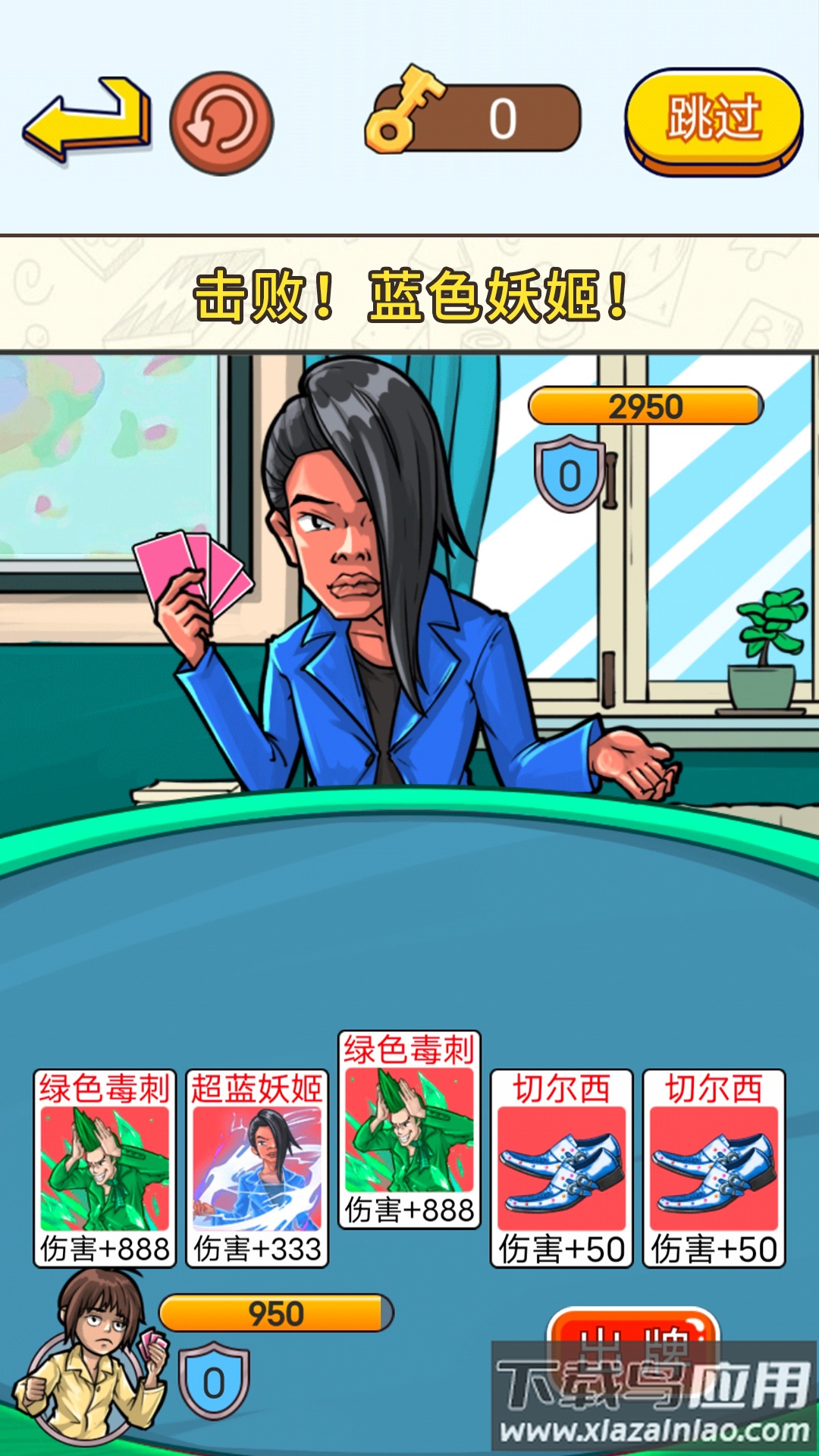 这是一款休闲益智游戏,核心是与蓝色妖姬进行趣味卡牌对决。