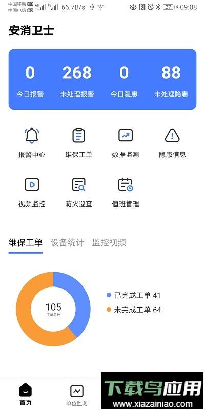 安消卫士是面向安全与消防场景的流程处理工具,核心功能涉及安消报警处理、实时视频监控、单位设备数据监测、维保工单管理与防火巡查。该应用结合消防智能设备的报警功能,构建起完整的告警处置、巡查与维保流程,形成一体化的安消解决方案。