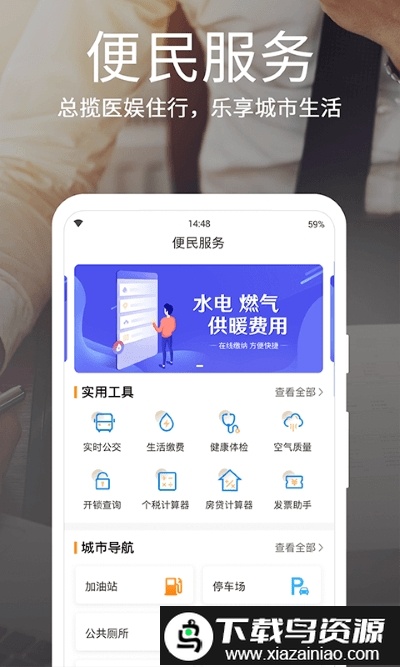 4、生活服务集成市民卡、实时公交、生活缴费、旅游查询等功能,并提供公厕、加油站、公交站点等城市导航服务。