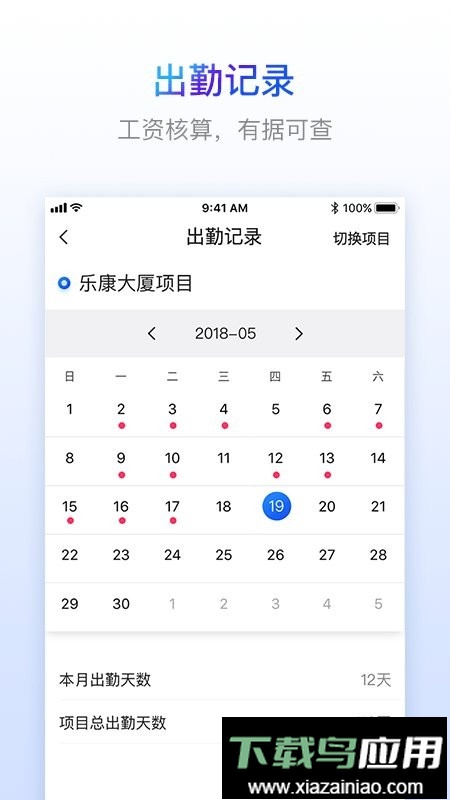 6. 考勤记录自动保存,可按项目筛选查看各自的考勤情况。