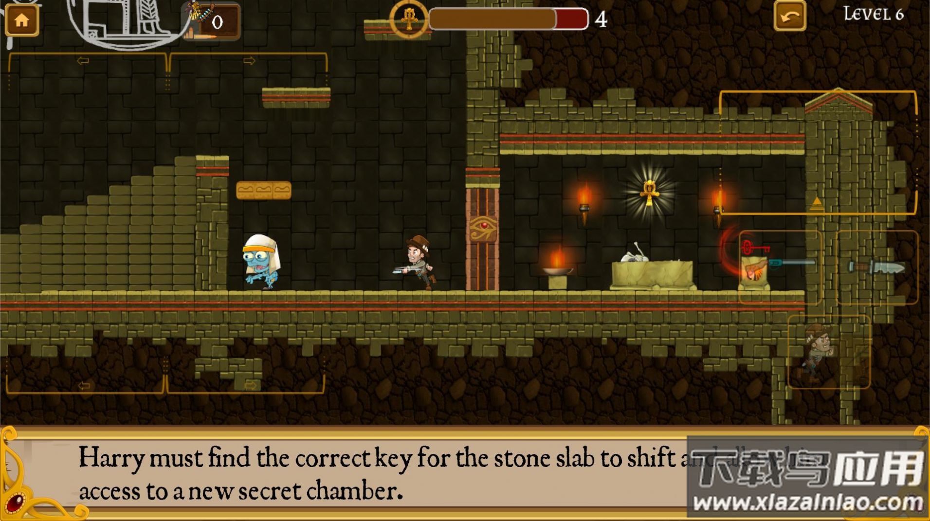这是一款横版益智闯关游戏。故事始于一位冒险家闯入金字塔,他渴望揭开尘封已久的隐秘,然而危机四伏,退路已断。他必须找到关键钥匙,对抗苏醒的木乃伊,为自己寻得一条生路。