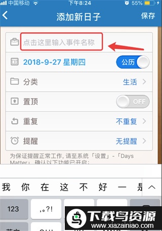 2、进入事件添加页面,根据提示填写事件名称、日期等相关信息,并进行个性化设置;