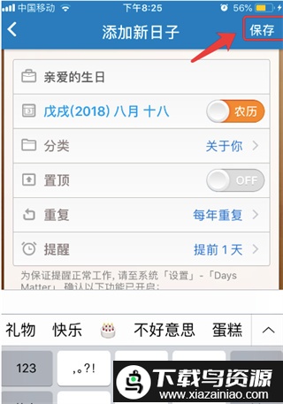 3、所有信息设置完毕后,点击页面顶部的保存按钮,即可完成倒数日的创建;