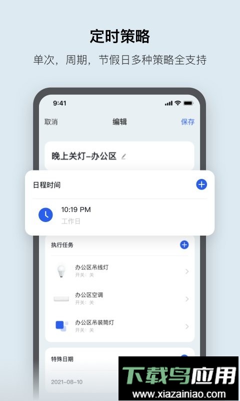 支持自定义定时策略,单次执行、周期循环及节假日计划均可设定;