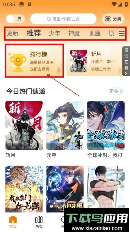 进入首页后,可通过上方菜单栏左右滑动选择分类,也可点击“排行榜”查看当前热门作品。