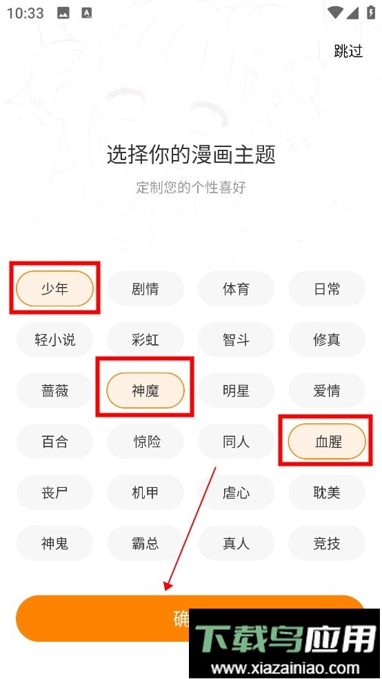 接下来可选择偏好的主题标签,例如喜欢“少年”“神魔”“血腥”类别的用户,勾选后点击确认即可进入。