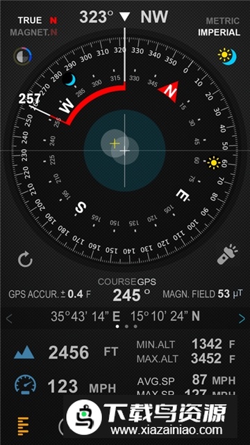实时显示设备相对于磁场的方向;支持在真北与磁北之间自由切换。