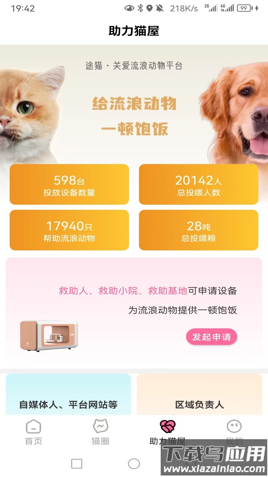 途猫流浪猫救助应用由天津途猫科技有限公司正式发布,这是一个专注于流浪动物关怀的线上平台。应用内设有多个功能板块,包括信息首页、互动猫圈、爱心猫屋支持以及个人中心等,旨在为流浪猫提供更有效的救助与关爱服务。对猫咪感兴趣的用户可以下载体验,共同参与这项温暖的事业。