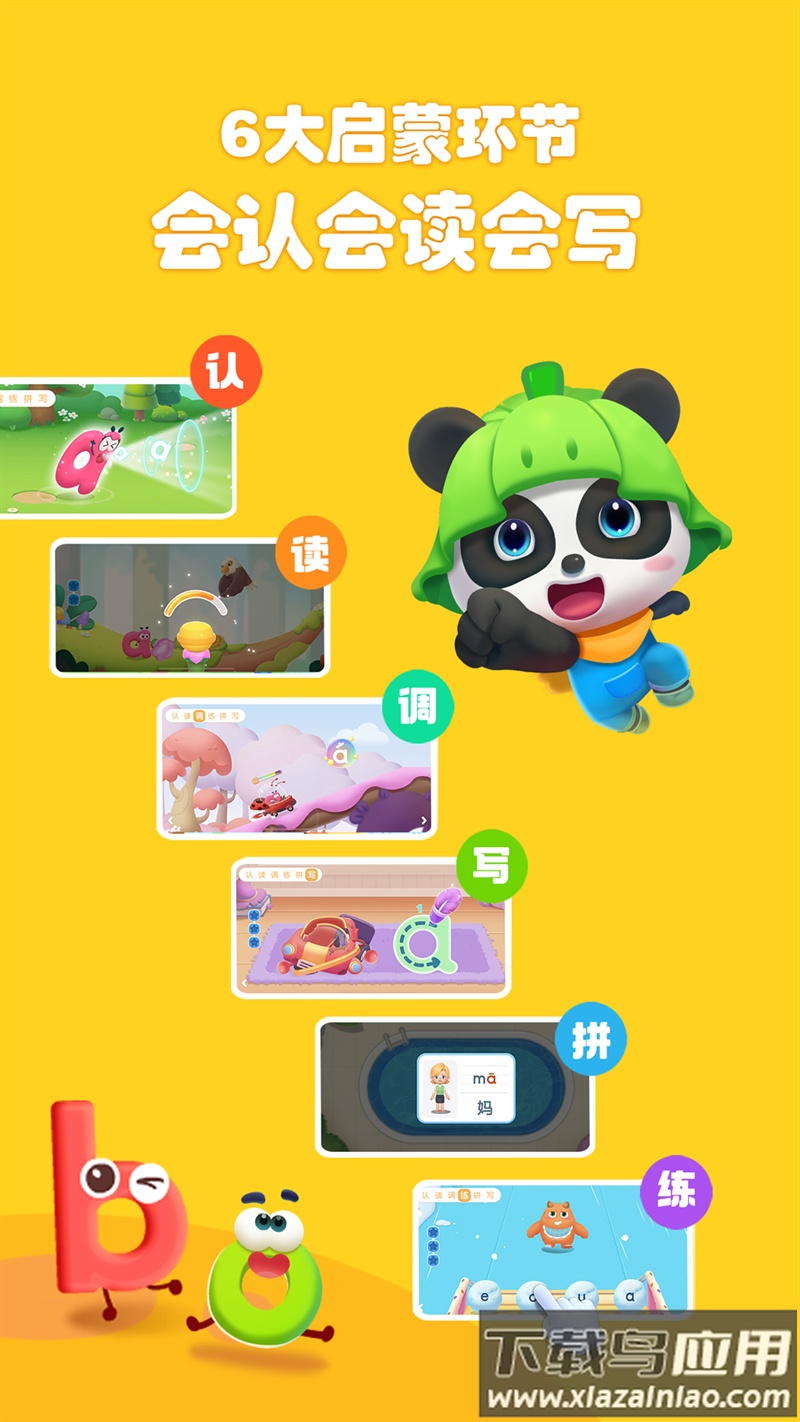 宝宝巴士拼音设计了认、读、调、练、拼、写六个学习步骤,从不同角度培养孩子对拼音的认知、发音、拼读和书写能力,适应各类拼音学习要求,为孩子日后自主识字与阅读做好充分准备。