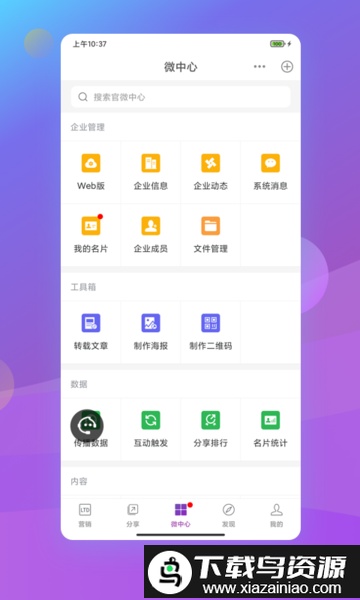官微中心app是一款专为企业设计的移动服务工具,帮助企业构建专属的产品营销平台。该软件功能全面,用户可便捷获取各类营销资源,助力企业高效成长,吸引更多关注并提升收益。同时支持企业数据管理,操作简单易用,有需要的用户欢迎在本站下载体验。