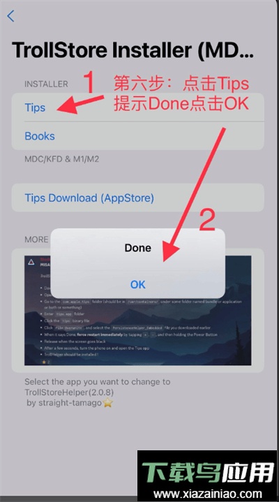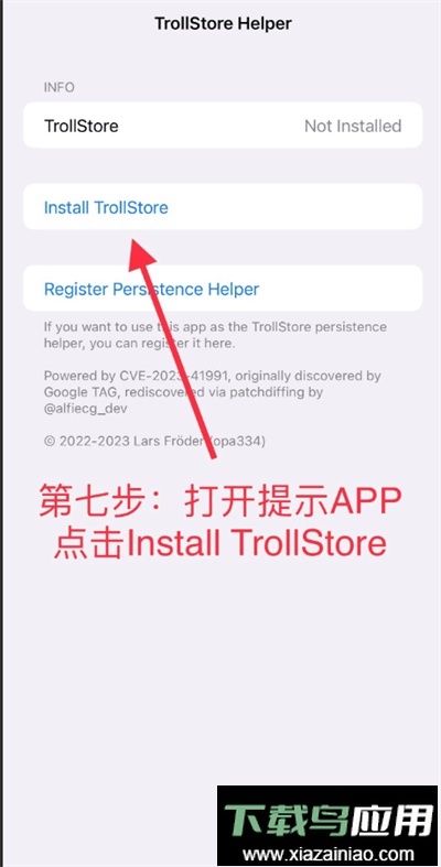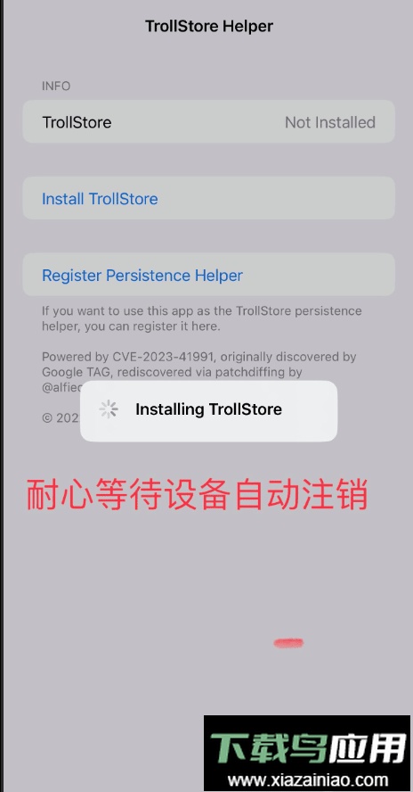 第七步:打开之前下载的“提示”应用,点击“Install TrollStore”按钮,然后耐心等待设备自动注销完成。