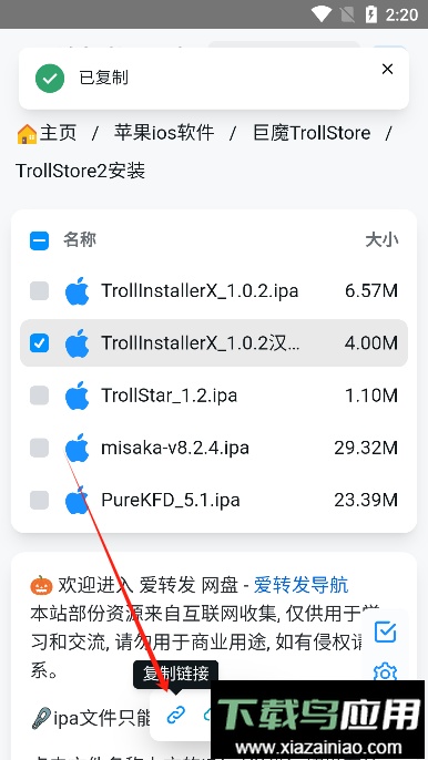 5、接着复制页面最下方的链接,你可以将其粘贴到QQ等社交软件中,然后使用苹果手机登录同一账号即可下载该文件。