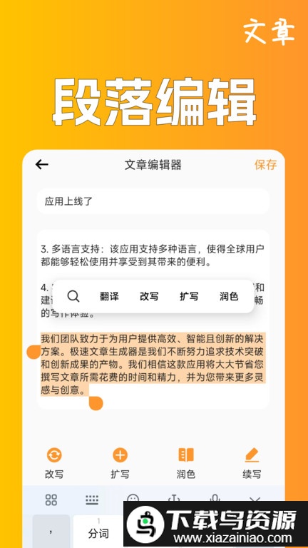 AI文章编辑器:对已有段落实现一键改写、润色、扩写或续写,全面辅助您的创作过程。
