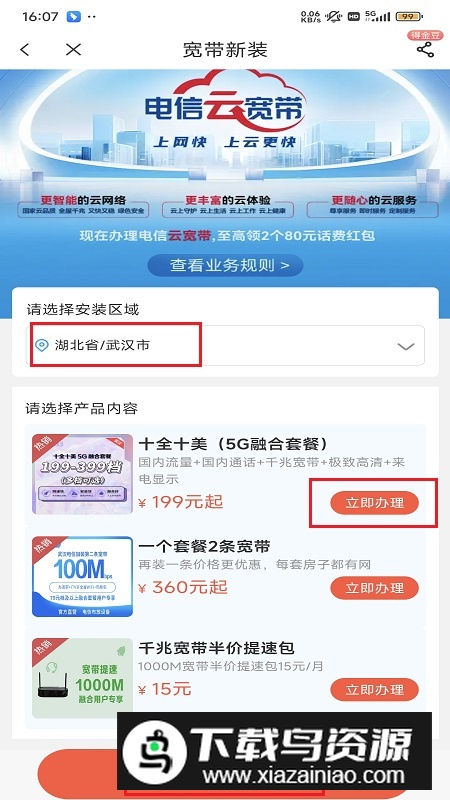 3、进入办理页面后,选择安装区域与合适的宽带套餐类型,点击“立即办理”提交申请;
