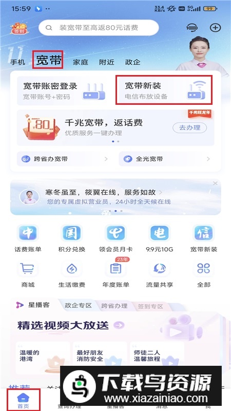 2、随后在“首页”找到“宽带”选项,点击其中的“宽带新装”;