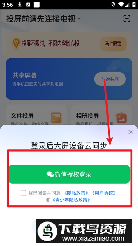 3. 登录成功后,返回主页点击“共享屏幕”按钮,选择“立即开始”,待搜索并连接到电视设备后,即可实现投屏。