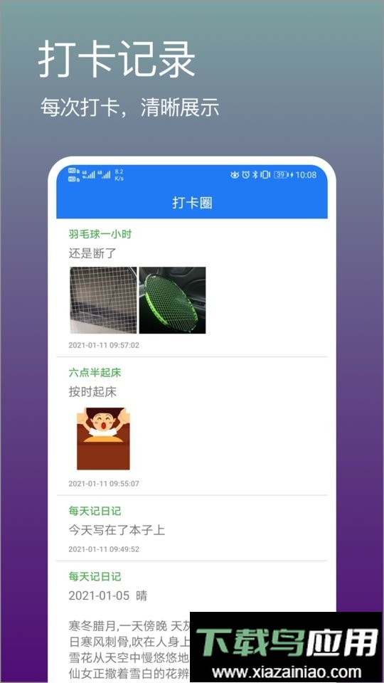 这款软件旨在帮助用户建立更好的生活节奏,通过每日打卡约束自己坚持做有意义的事。你可以随时回顾自己的打卡历程,见证点滴努力,从而活出更充实的人生。