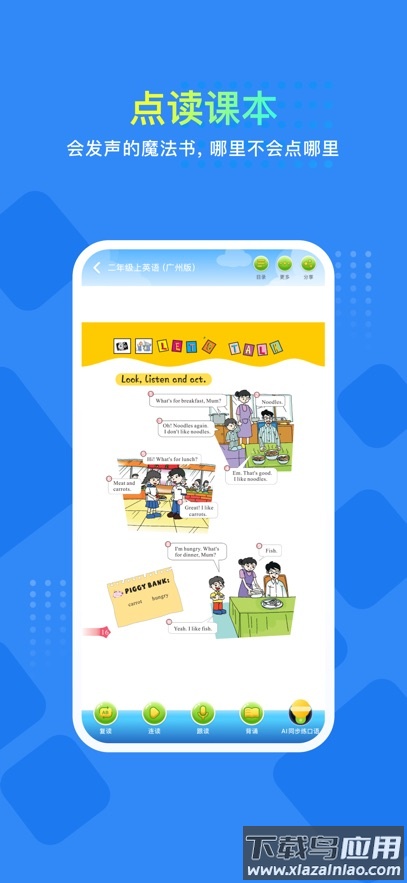 应用具备课本点读功能,让文字内容通过声音呈现,支持听读同步训练,并内置口语评测,帮助纠正发音。