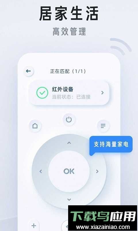 万能遥控器家用整合了电视、空调、机顶盒、扫地机器人、灯具、电扇、空气净化器、投影仪以及热水器等多种家电的遥控功能;这款家居智能软件让你通过手机就能轻松管理家电,从此告别四处翻找遥控器的烦恼。