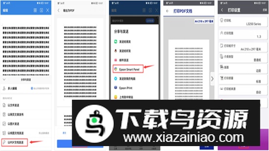 2.点击“以PDF文档发送”选项,选择“PDF格式输出”;发送时分析并选择“Epson Smart Panel”,随后点击“打印”按钮;在“打印设置”界面调整相关参数,最后点击“开始”按钮即可完成打印。