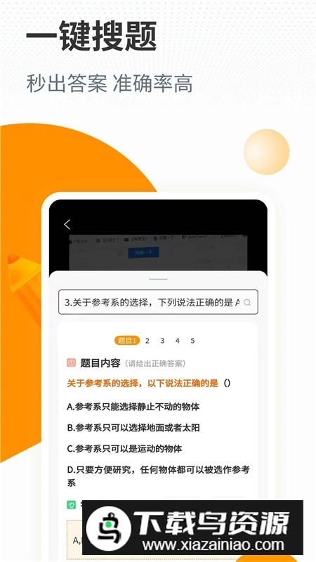 1. 拍照搜题;即时拍摄题目,解析结果快速呈现。