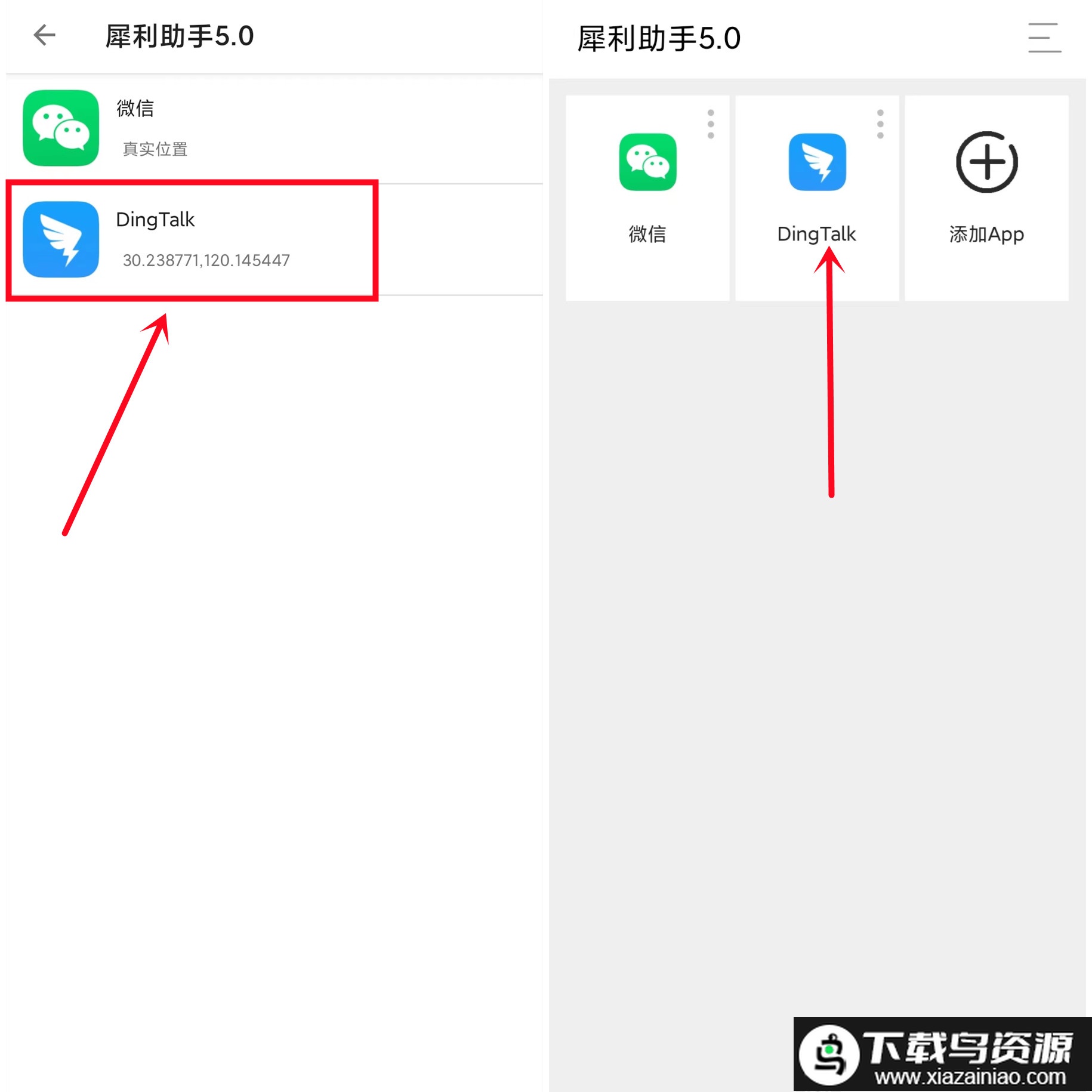 软件操作直观易上手;下载后首先点击添加App,选择需要修改定位的软件,例如同时添加微信与钉钉,实现多开与定位双重功能。