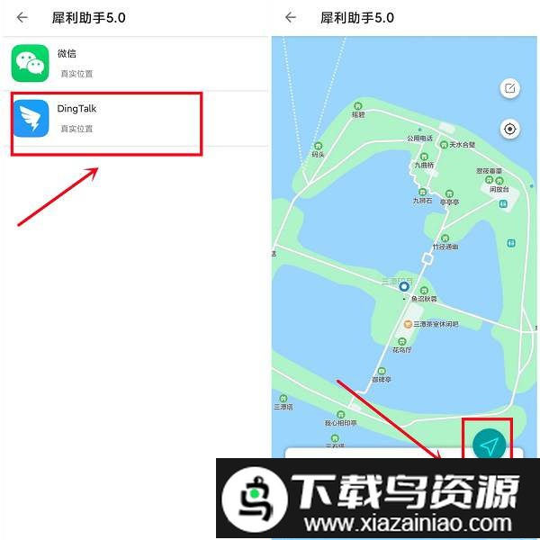 进入地图页面后,选取需要模拟定位的应用,这里以钉钉为例;地图可自由缩放与移动,确定目标位置后点击定位箭头确认,随后向左滑动返回。