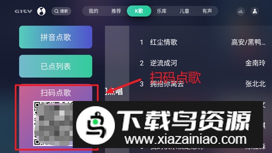 3. 留意左下角显示的扫码点歌二维码,使用手机打开qq音乐客户端扫描该二维码,即可通过手机进行点歌操作