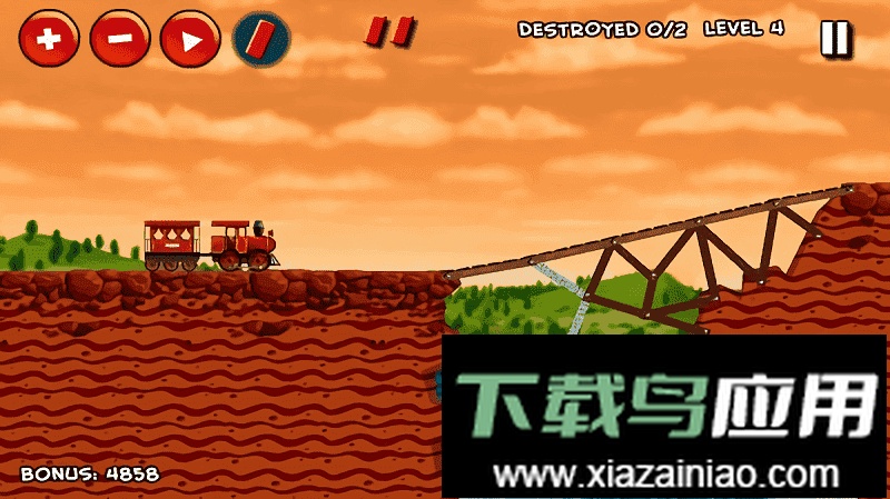 火车即将驶过大桥,你的任务是在桥上设置炸药,令其坠入山崖;游戏采用关卡推进模式,通过一关后自动解锁下一关;随着关卡深入,难度逐渐提升;玩家需要运用力学原理,破坏桥梁的结构平衡,才能确保火车成功坠落。