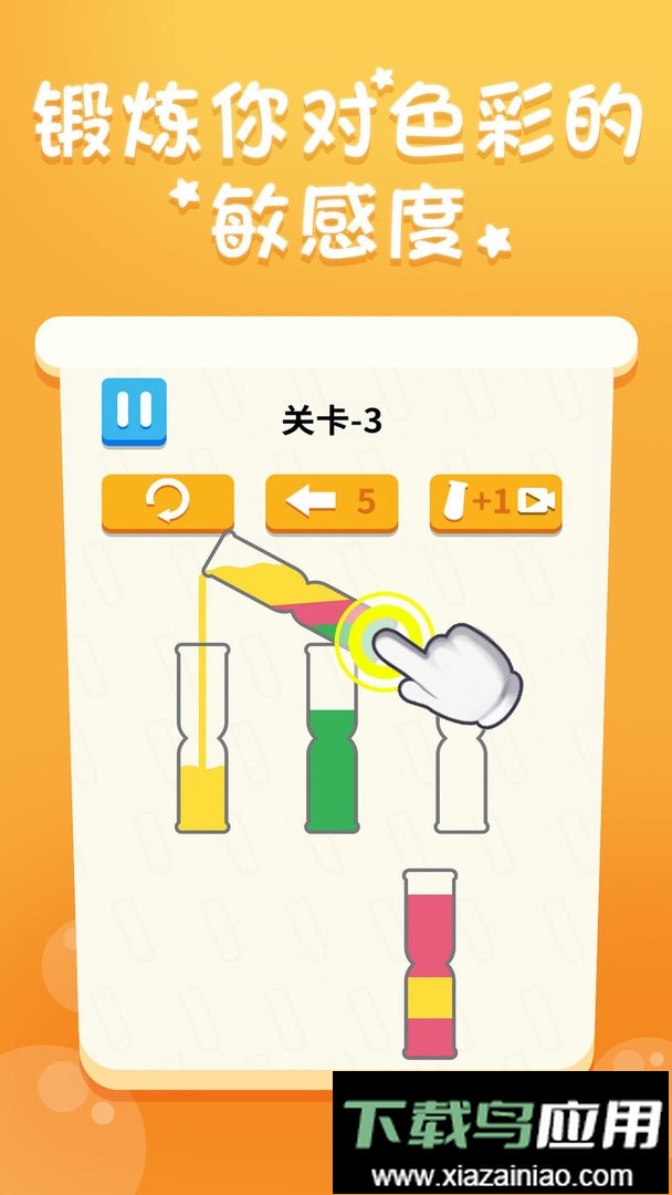 倒水我最牛是一款休闲益智类手游,玩法轻松有趣。游戏内含大量精心设计的关卡,玩家只需通过简单的移动操作,将不同瓶子中的液体按颜色进行分类排序,最终使每个瓶子仅保留一种颜色,即可顺利过关。