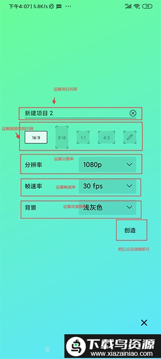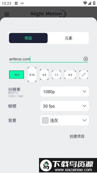 在此可以设置项目名称、宽高比例、分辨率、帧速率以及背景颜色;