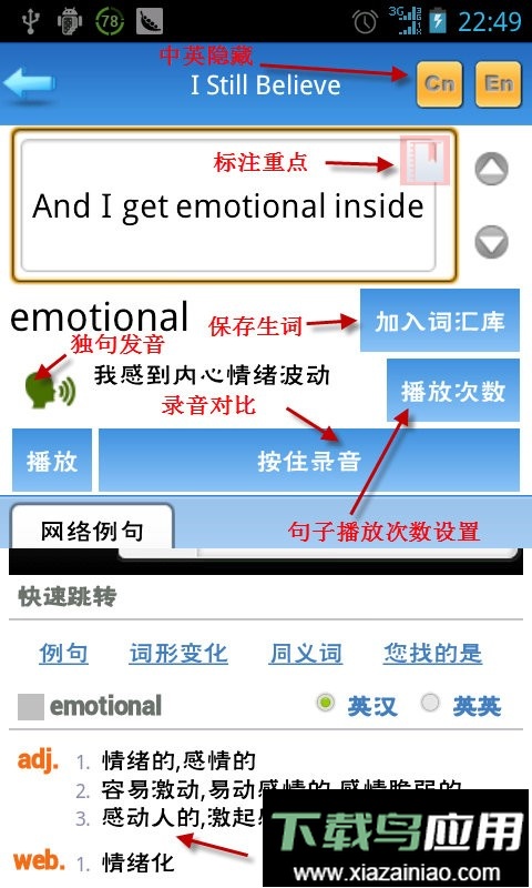 3. 字幕列表界面可进行单句发音、收藏重点内容;支持将生词加入单词库,录音后与原声比对,并自由隐藏中文或英文。