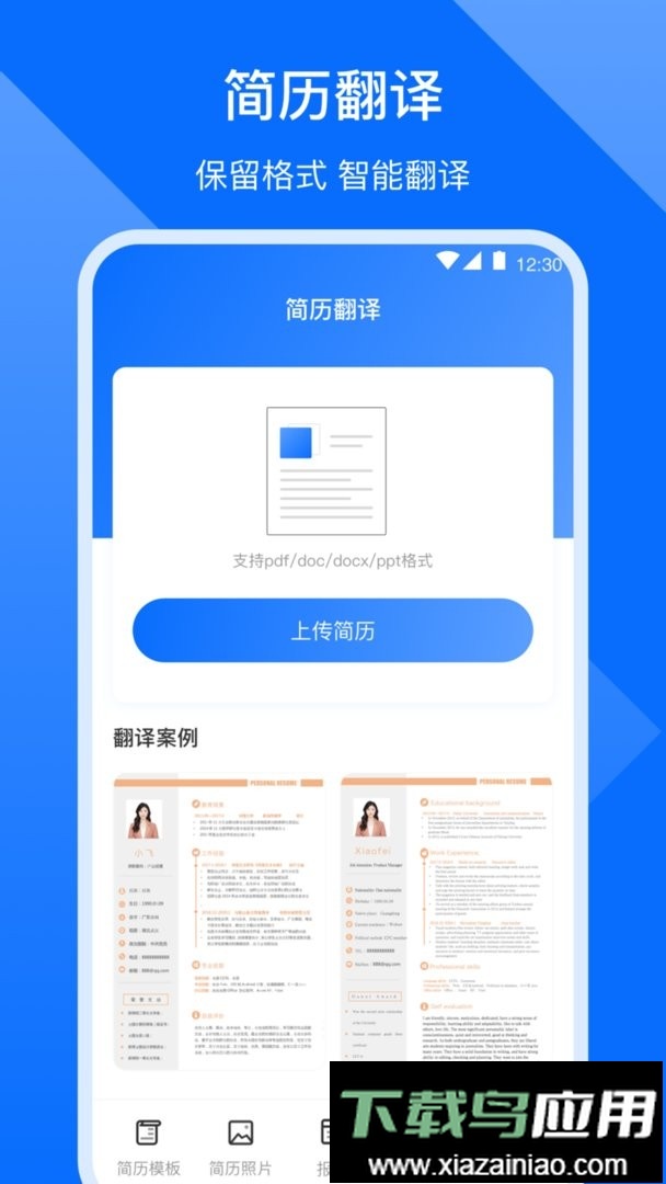 应用提供大量精选简历模板,用户能够便捷地一键切换数十款不同设计,操作如同更换照片滤镜般简单;系统自动生成排版精美的简历文档。