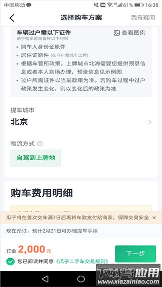 10、双方达成意向后,点击“立即订购”填写购车信息;选择上牌城市时请留意过户所需证件提示;平台支持异地提车,需仔细阅读相关物流安排。