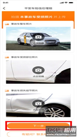 2、按要求拍摄车辆受损部位照片,随后点击下一步;