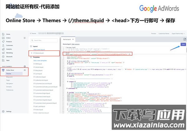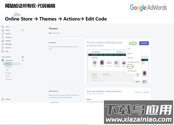 3、登录Shopify后台,依次进入“在线商店”、“主题”、“操作”、“编辑代码”,打开代码编辑页面;