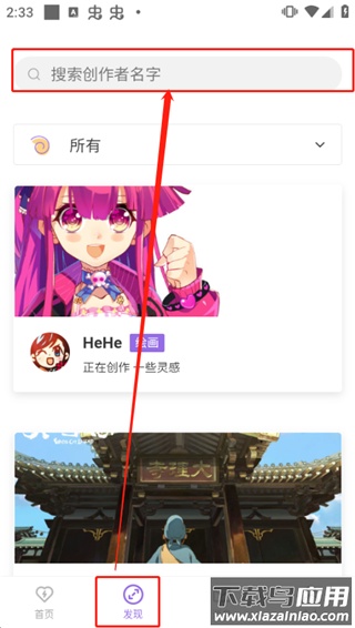 1、进入app首页点击“发现”,在顶部搜索框输入创作者名称;