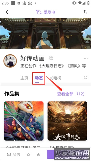 2、以“好传动画”为例,进入其主页后选择“动态”栏目,点击“作品集”并选择查看全部作品;