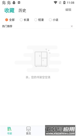 3、在书架页面,您可以查看已收藏的漫画资源,也能浏览阅读历史记录;