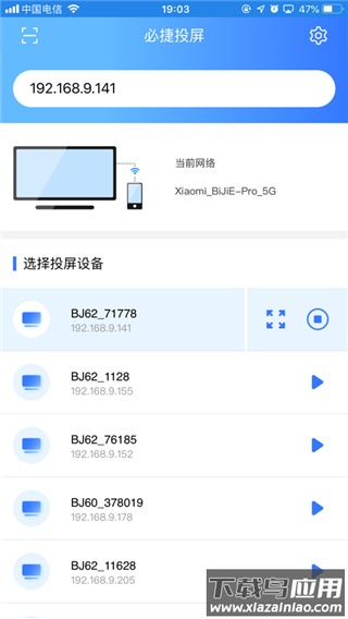 3、应用会自动列出同一网络下的可用设备,从中选择需要投屏的目标设备;