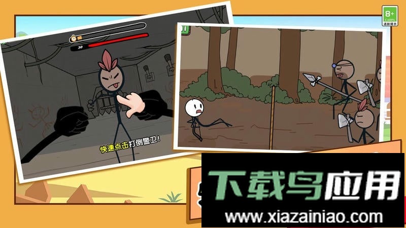 3. 内容经过趣味改编,采用卡通简约画风制作,众多火柴人角色等你通过闯关来获取。